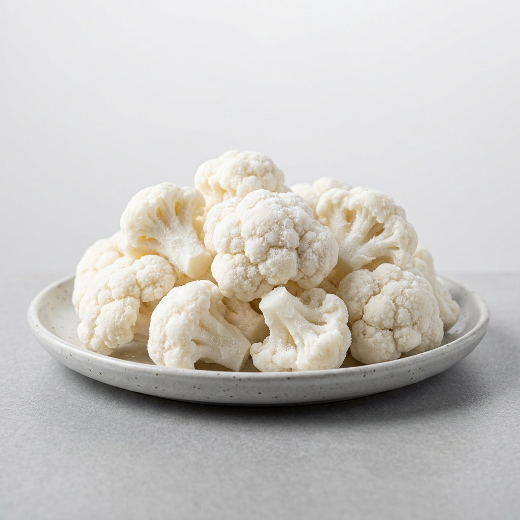 Bright white cauliflower florets professionally frozen to ensure quality.