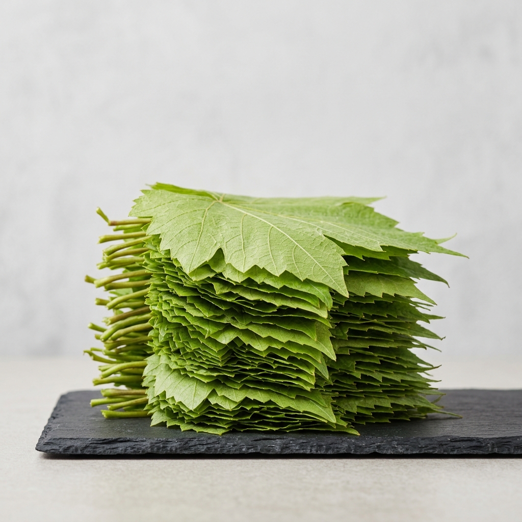 Egyptian vine leaves frozen at peak softness, sorted for perfect stuffing.